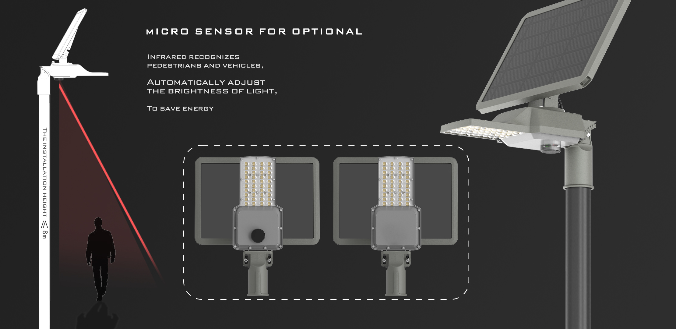 - Microwave Senser:10-16m,IR Senser: 9-14m